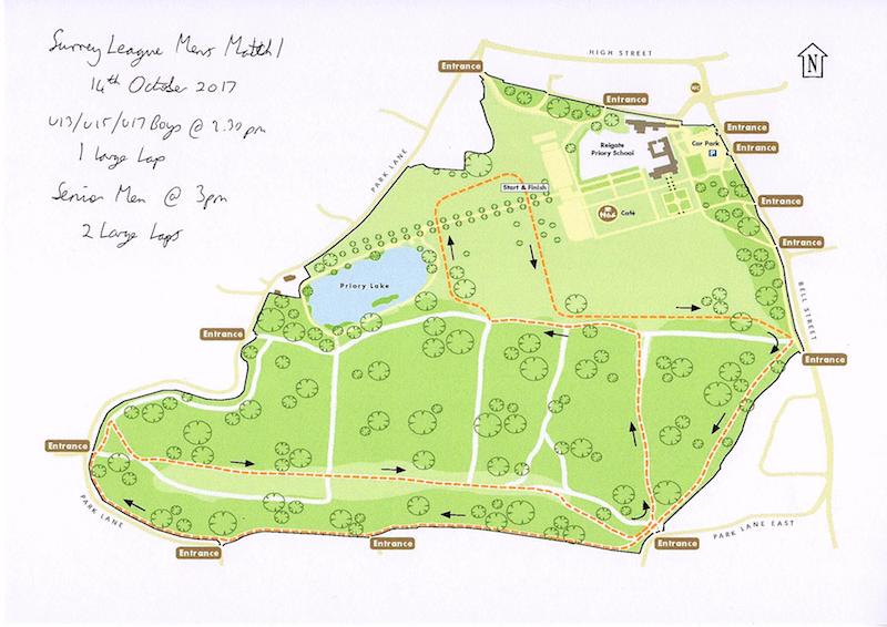 The course will be the usual 2.5 mile undulating route used for previous Surrey League fixtures. The route will be marked with flags/signs/tape and there will be marshals at key junctions. Recommended footwear will be fell shoes/spikes (or shoes with very good off-road grip). There is a long and technical descent towards the end of the lap that requires particular care.